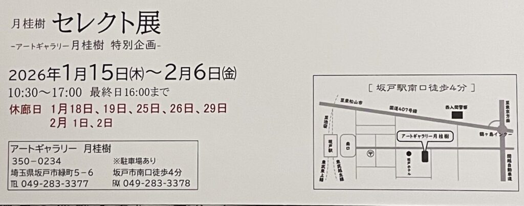 10:30~17:00 最終日は16:00 まで(休廊日については写真をご覧ください)
